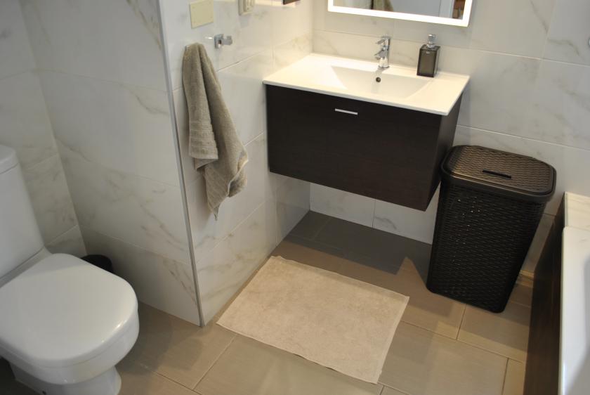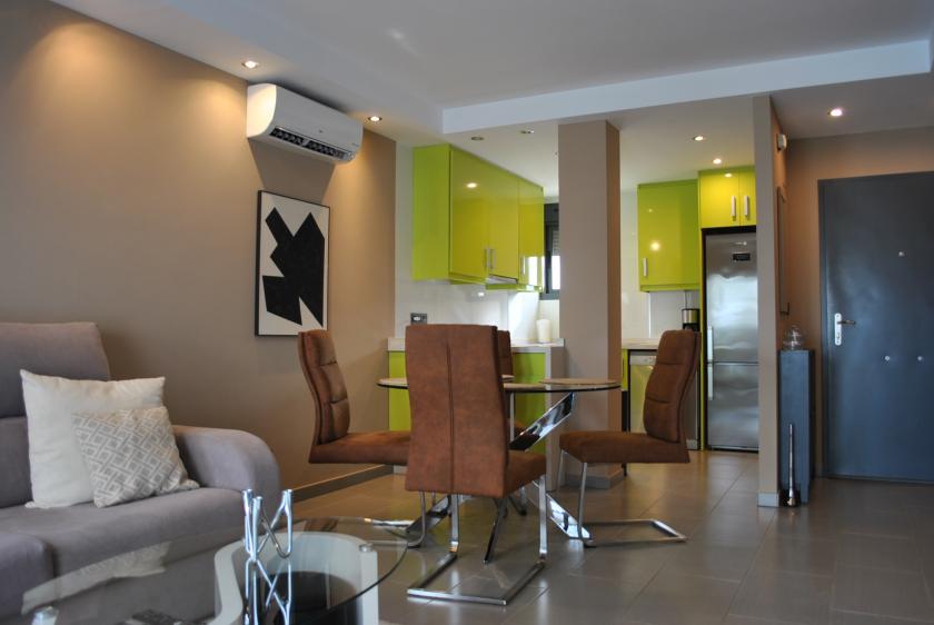 The modern kitchen is fully equipped, including a dishwasher. The bedrooms are furnished with two double beds, while the living room is equipped with air conditioning (both hot and cold), a SMART TV, and Wi-Fi.
