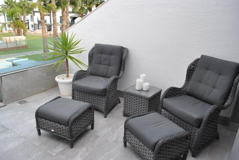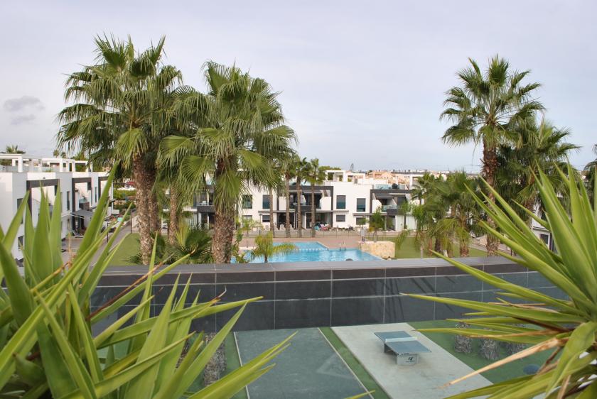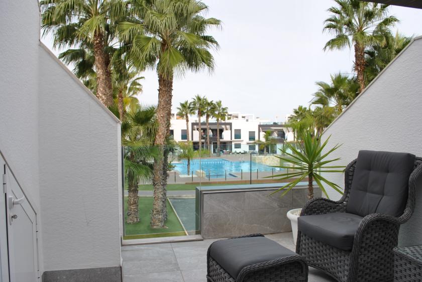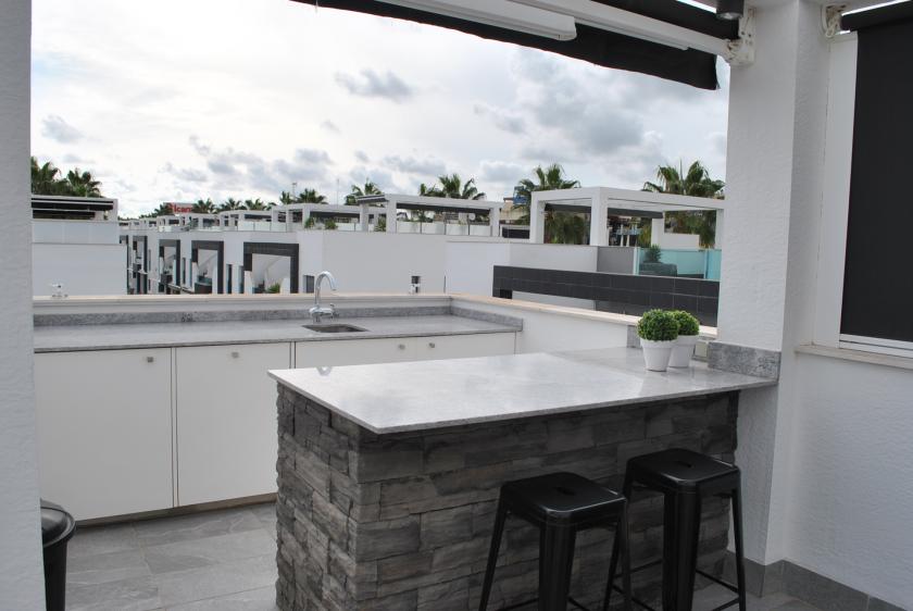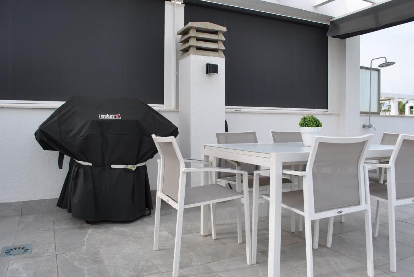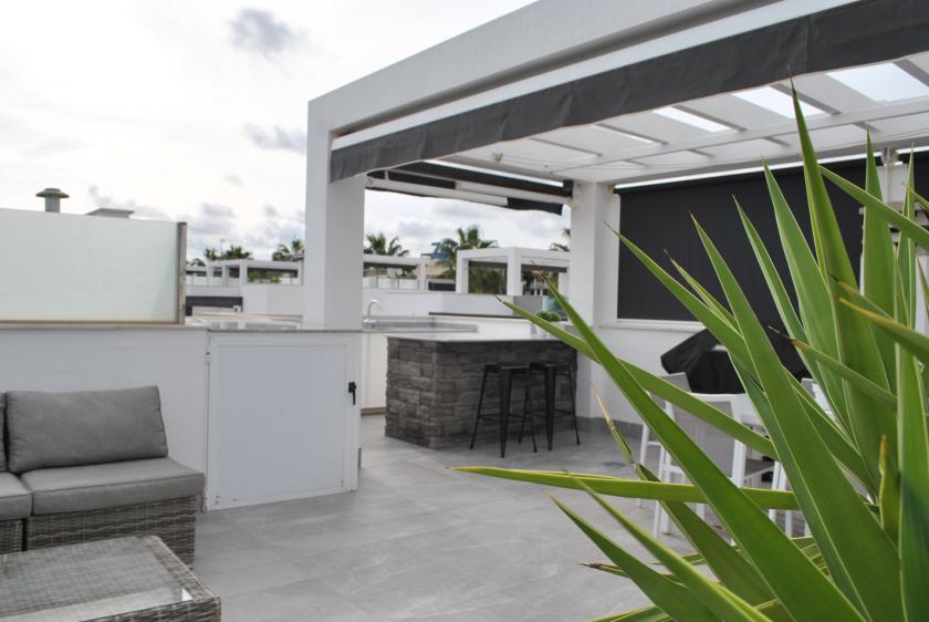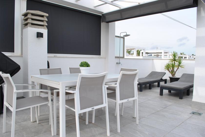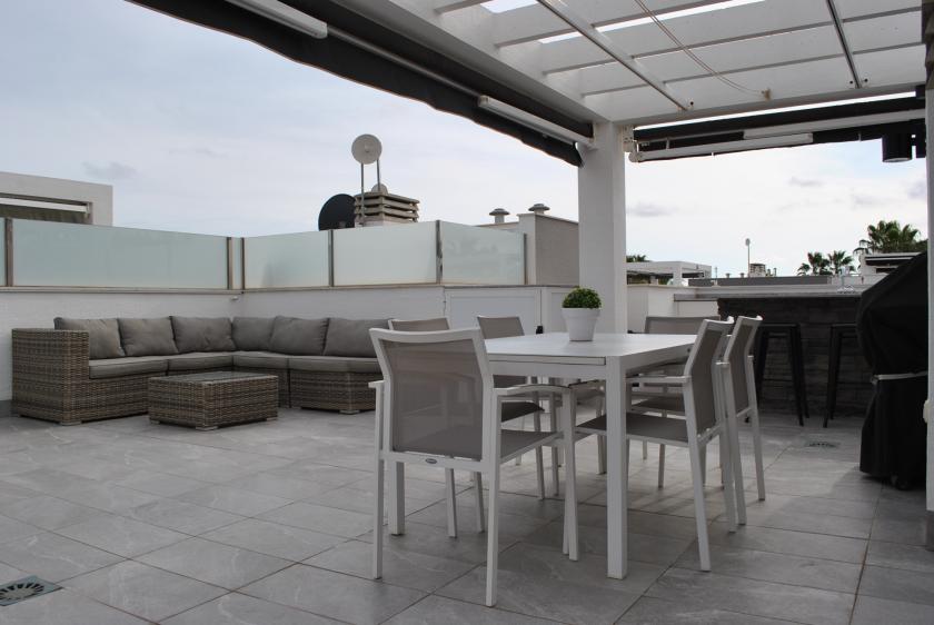 This stunning penthouse in Phase 6 boasts an excellent location, just 200 meters from CC La Zenia Boulevard. It is equipped with all the comforts needed for a delightful stay. The property features a spacious living room, two bedrooms, and two bathrooms, complete with both a bathtub and shower facilities. Enjoy a balcony and a generous rooftop terrace of 55 m², furnished with sun loungers, a lounge set, and a BBQ. From this vantage point, you can take in lovely views of the sea, communal garden, and swimming pool.