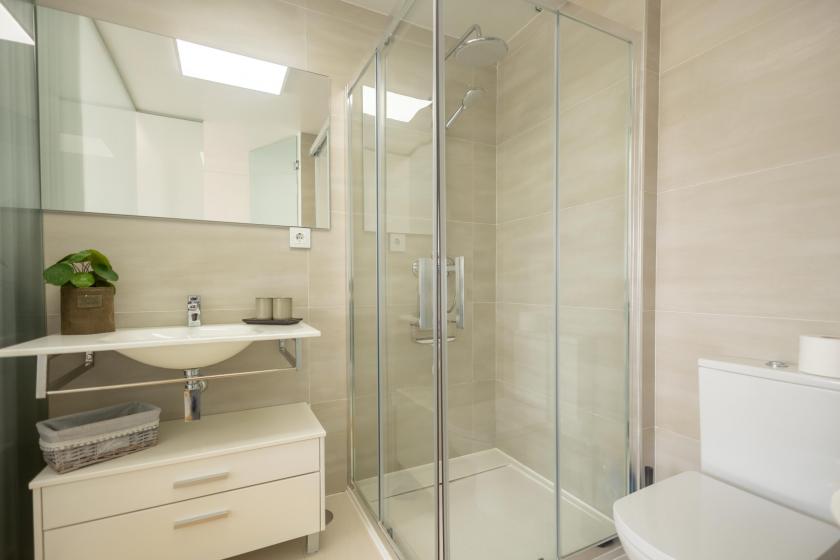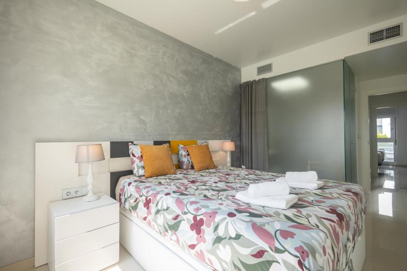 El apartamento es amplio y decorado con buen gusto, con una sala de estar que incluye un televisor inteligente, WiFi y una cocina abierta completamente equipada con todos los electrodomésticos necesarios, incluida un lavavajillas. Hay dos baños (uno de ellos en suite) con duchas a ras de suelo y dos dormitorios, uno con una cama doble y otro con dos camas individuales, todos con armarios empotrados. La calefacción y el aire acondicionado están disponibles para refrigeración y calefacción.